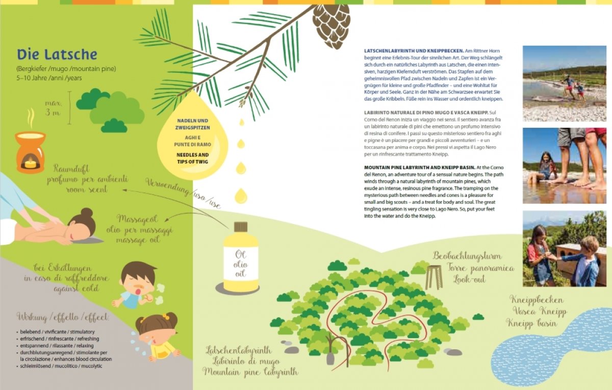 Latschenlabyrinth am Rittner Horn. Der geheimnisvolle Weg durch den Latschenwald mit seinem intensiven, harzigen Kiefernduft ist ein Vergnügen für kleine und große Pfadfinder und ganz in der Nähe am Schwarzsee das Kribbeln spüren im Kneipp-Becken.