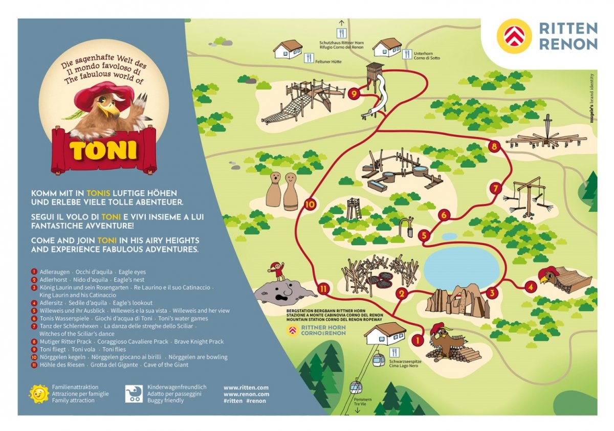Es war einmal... Die sagenhafte Welt des ToniDer Adler Toni, der schon den ganzen Winter über das Rittner Horn flog, und die Aufmerksamkeit des einen oder anderen Skifahrers und Wanderers auf sich zog, kehrt auf den Ritten zurück. Er – König der Lüfte –, der alles bestens überblickt, hat sich nach vielen Reisen das Rittner Horn für seine neue Abenteuerwelt ausgesucht. Geht oder fliegt mit ihm über diese Welt, wo er und auch seine Vorfahren schon einmal gelebt haben! Zuerst könnt ihr genauso fliegen wie Toni und zwar bis zur Schwarzseespitze. Dazu braucht ihr keine Flügel, sondern es geht auch ganz einfach mit der Rittner Horn Bergbahn. Bei der Bergstation angekommen sind es nur ein paar Schritte bis zu dem Panoramaturm. Wenn ihr dort hinaufsteigt, habt ihr genauso wie unser Toni den Mega-Überblick… Und was gehört für Toni in eine sagenhaftes Abenteuerwelt? Ein riesengroßes Adlernest, so groß, dass es schon ein Labyrinth ist, eine Wasserwelt mit Kneippbecken und Wasserrinnen zum Planschen und Spielen, Klettermöglichkeiten, sagenhafte Ausblicke, spannende Einblicke in eine andere Welt … Aber kommt und erlebt es selbst! Eines können wir euch jetzt schon verraten: langweilig wird es mit Toni nie!